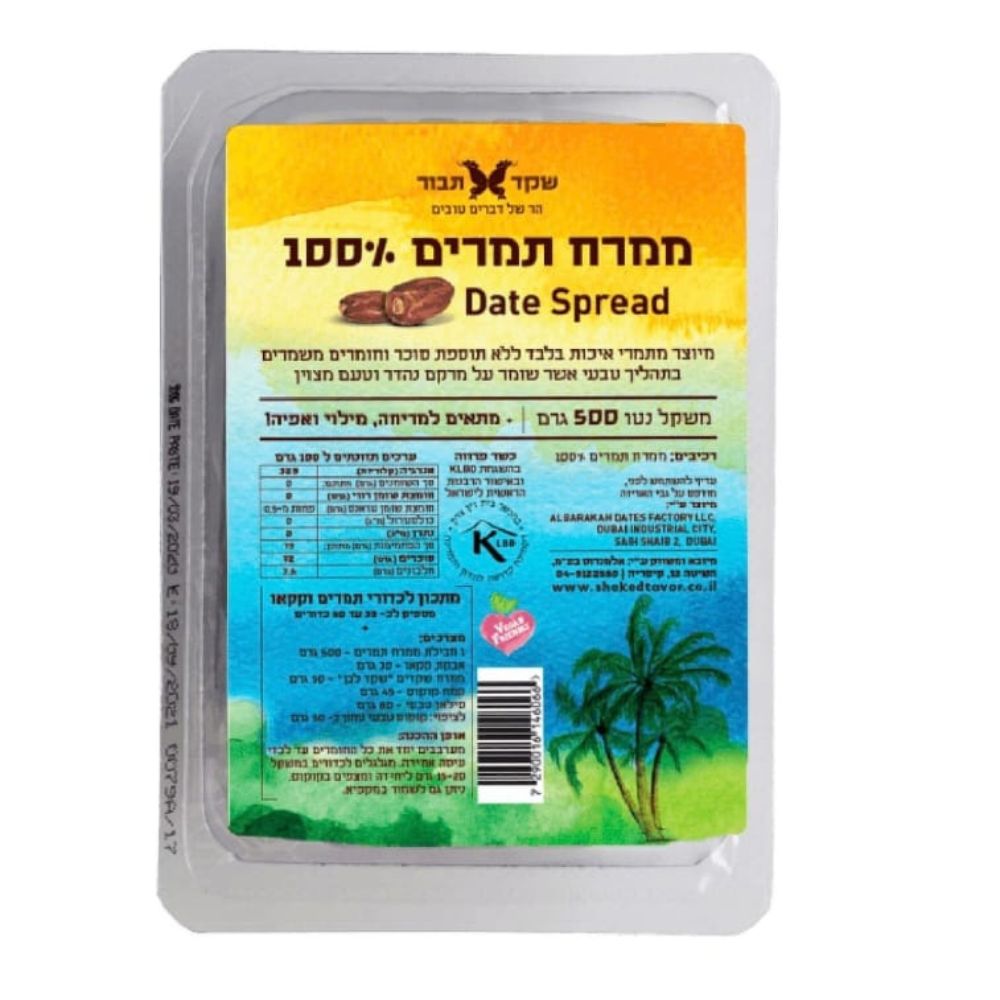 ממרח תמרים % 100 ,משקל נטו 500ג. מתאים למריחה ,מילוי ואפיה